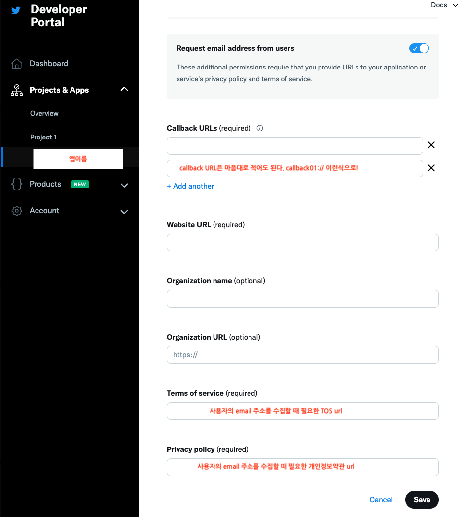 1. ํธ์ํฐ ๊ฐ๋ฐ์ ํ์ด์ง์ ๋์ ํ๋ก์ ํธ ์ฑ์ ๋ค์ด๊ฐ์ callback url์ ์ค์ ํด์ค๋ค.
