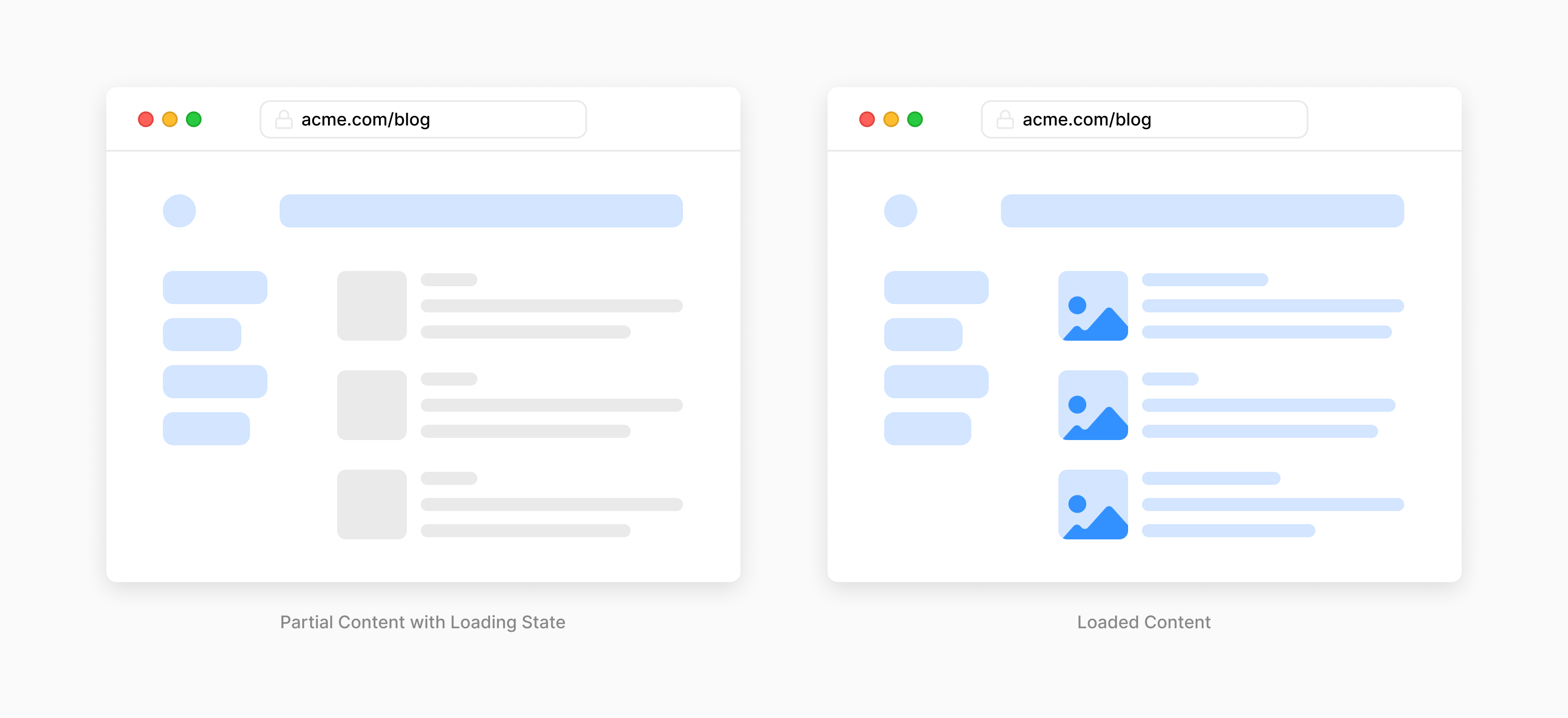 Next.js์ Server Components์ ์ค์ฒฉ๋ ๋ ์ด์์์ ์ฌ์ฉํ๋ฉด, ๋ฐ์ดํฐ๋ฅผ ๋ช ์์ ์ผ๋ก ํ์๋กํ์ง ์๋ ํ์ด์ง ๋ถ๋ถ์ ์ฆ์ ๋ ๋๋งํ๊ณ , ๋ฐ์ดํฐ๋ฅผ ๊ฐ์ ธ์ค๋ ํ์ด์ง ๋ถ๋ถ์๋ ๋ก๋ฉ ์ํ๋ฅผ ํ์ํ ์ ์๋ค. ์ด ๋ฐฉ์์ ํตํด ์ฌ์ฉ์๋ ์ ์ฒด ํ์ด์ง๊ฐ ๋ก๋๋๊ธฐ๋ฅผ ๊ธฐ๋ค๋ฆด ํ์ ์์ด, ์ฆ์ ์ํธ ์์ฉํ ์ ์๋ค.